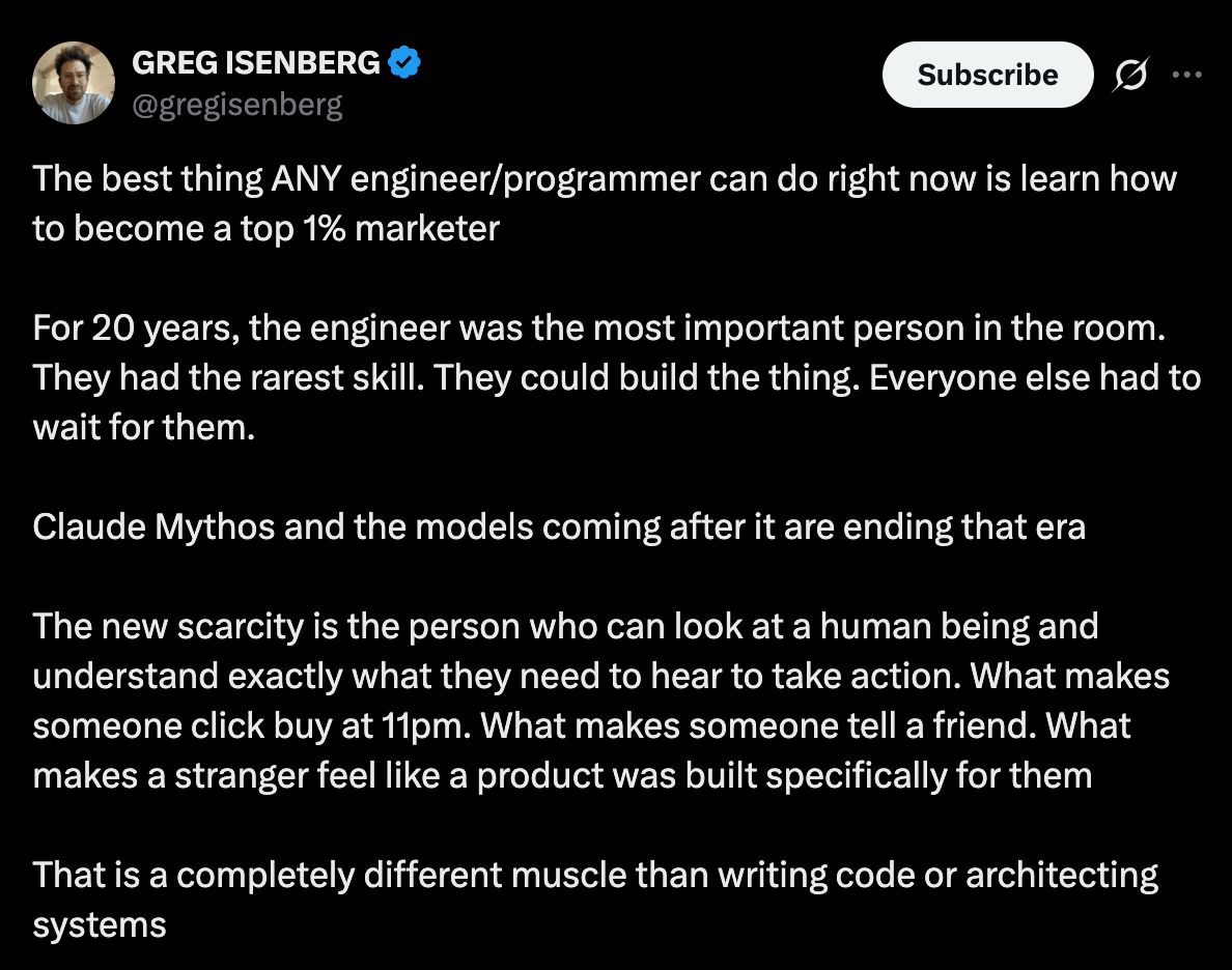 I have also know for years that a mix of coding and marketing skills is powerful, but now with AI and Claude Code, coding is not the key leverage, distribution is