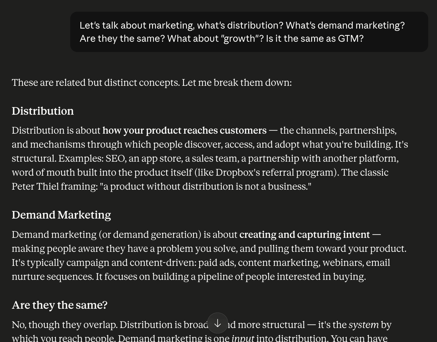 Claude: I started by asking Claude a few questions and how I should learn about distribution and GTM